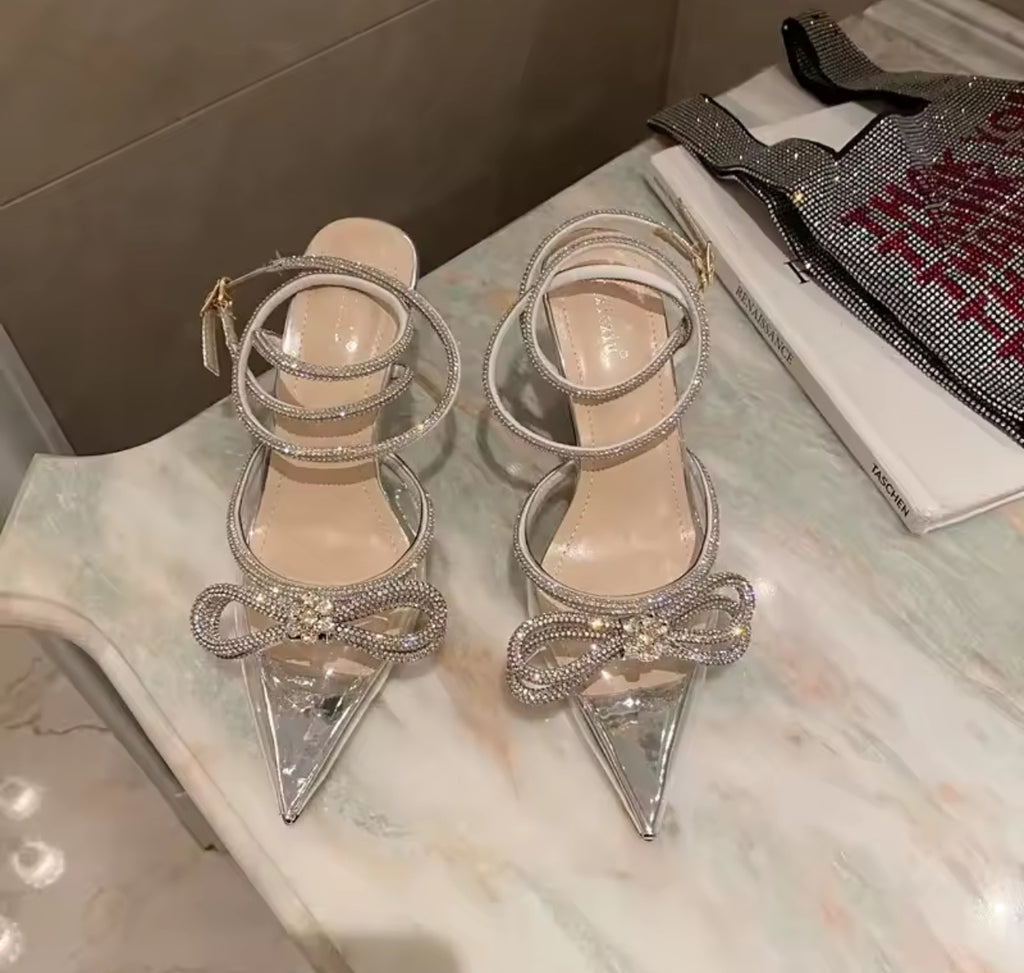 Women's Style Pointed-Toe Bow Heels with Rhinestone Embellishments High Heels Fine-Cut Platform Sandals Summer Wear