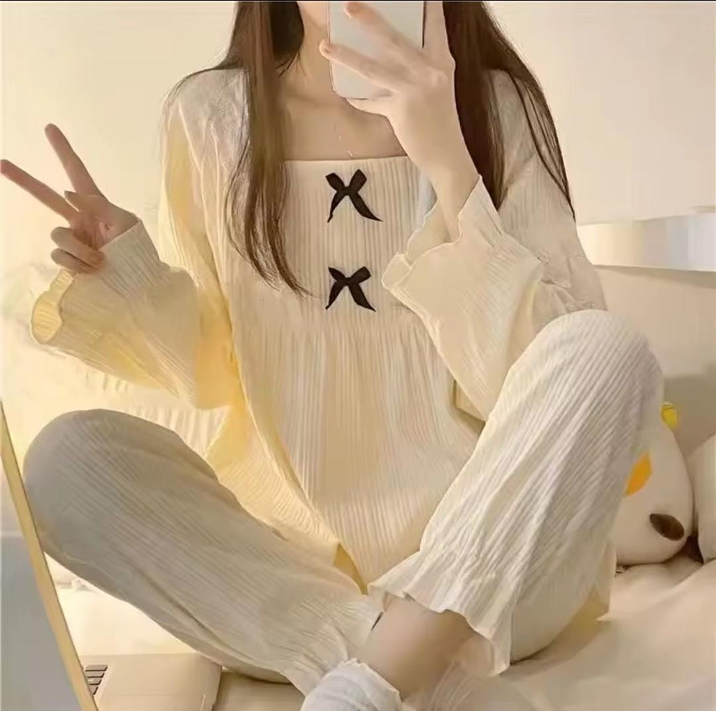 Casual Lace Trim Sleepwear Set for Women Spring Autumn Princess Style Butterfly Knot New INS Style Girl Outdoor Wearable.