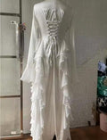 Elegant Multi Ruffle White Dress Women Draped Long Flare Sleeve O-neck High Waist Maxi Dresses Summer Party Female Robes.