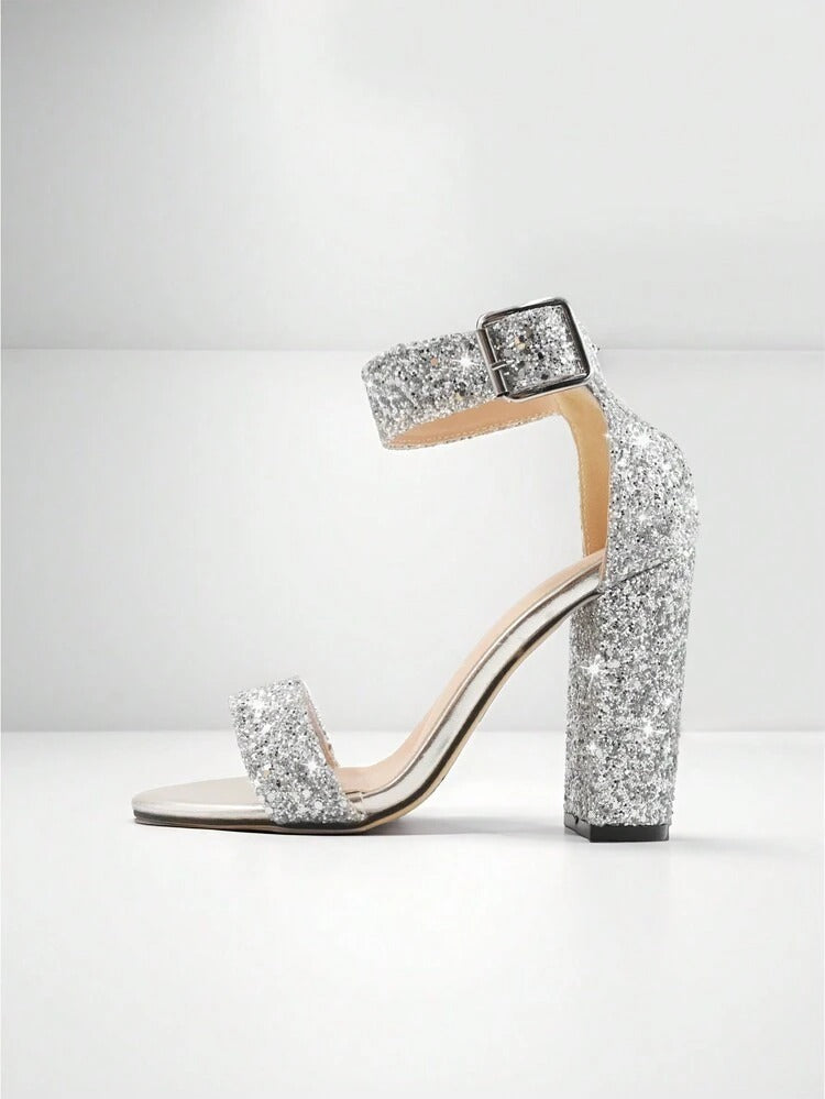 Glamorous Sequin Decoration Ankle Strap Chunky Silver Sparkly Heeled Sandal S4974417