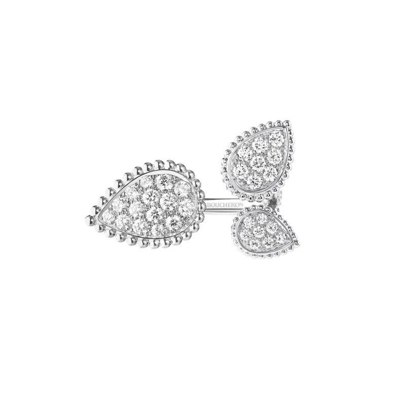 This three-headed ring breaks codes and features the iconic motif in three different formats. Three diamond-paved drops surrounded by gold beads stand for the three petals of a flower that reveals glimpses of bare skin underneath.