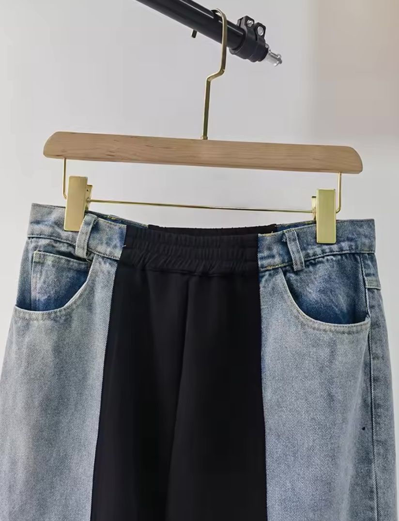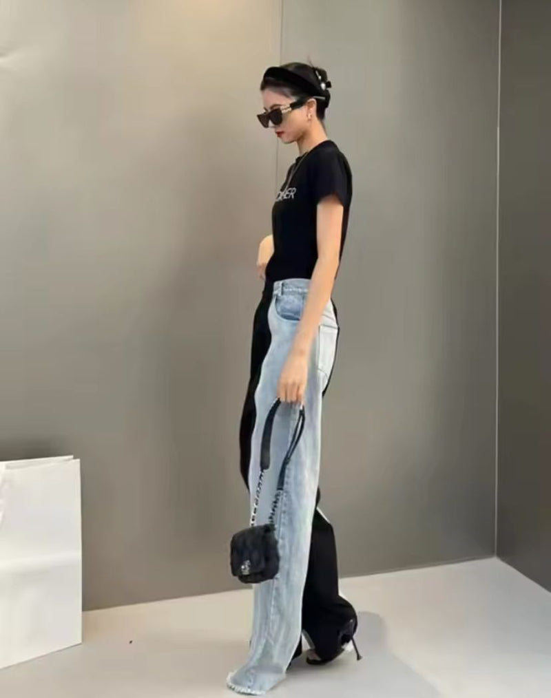 Colorblock Denim Pants for Women High Waist Split Pockets Wide Leg Long Trousers Female Clothing Summer Fashion.