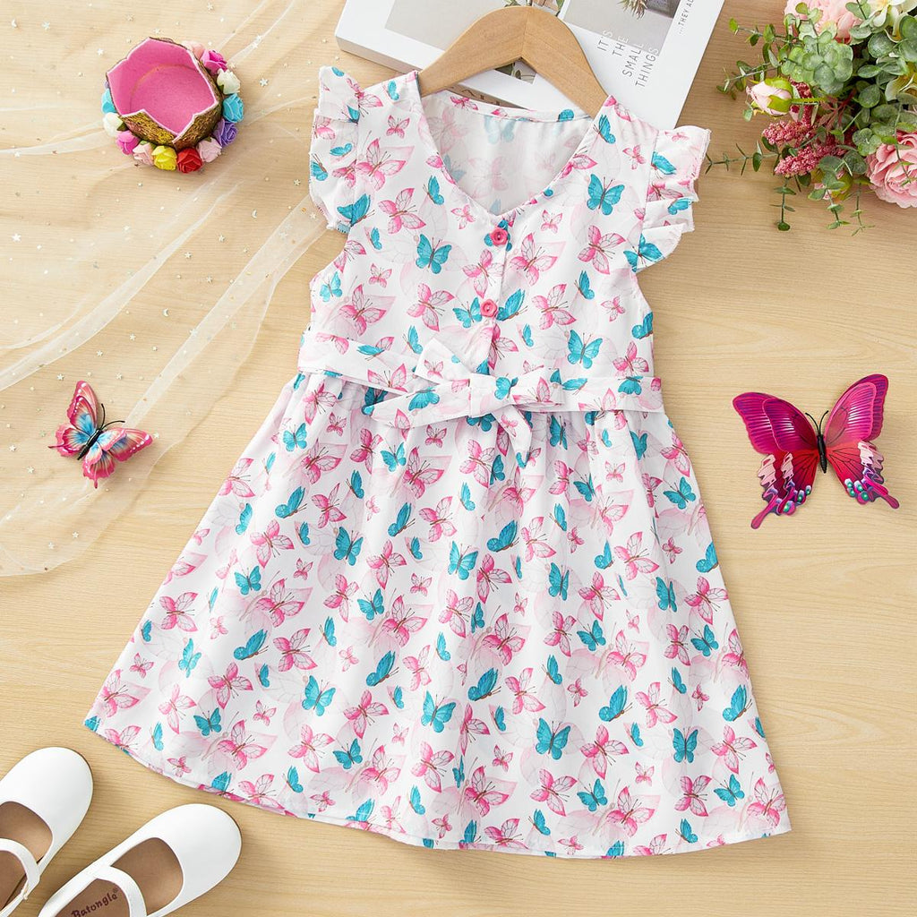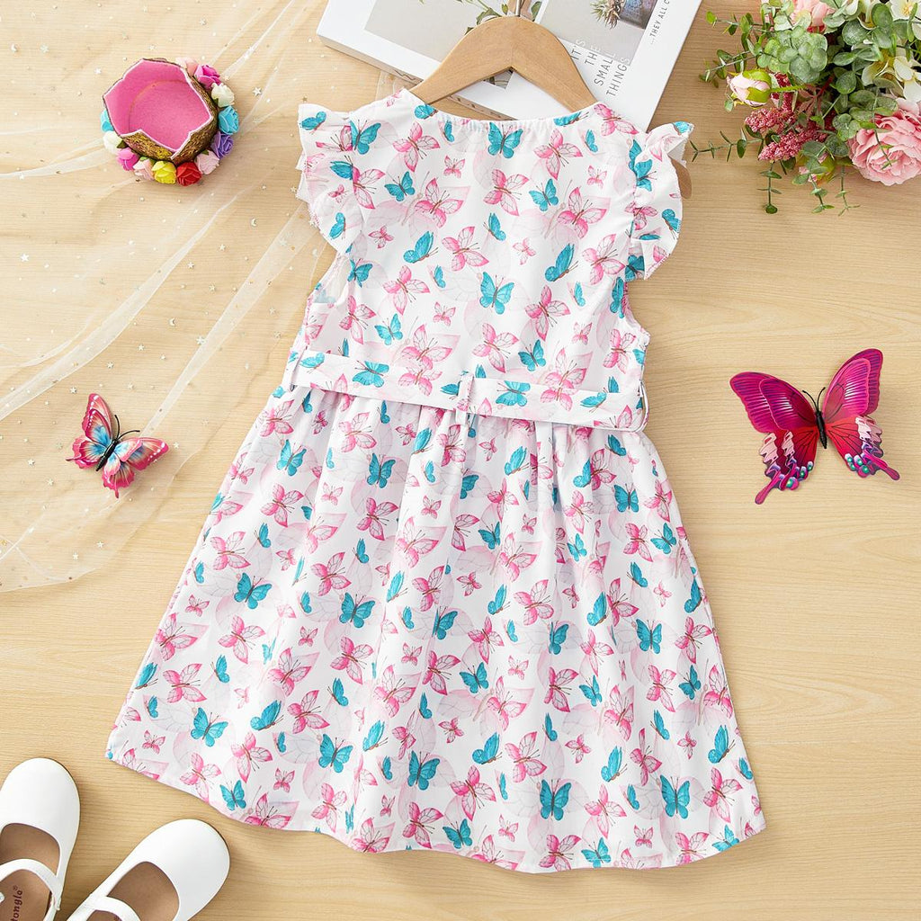Toddler Girls Butterfly Print Ruffle Trim Belted Dress.
