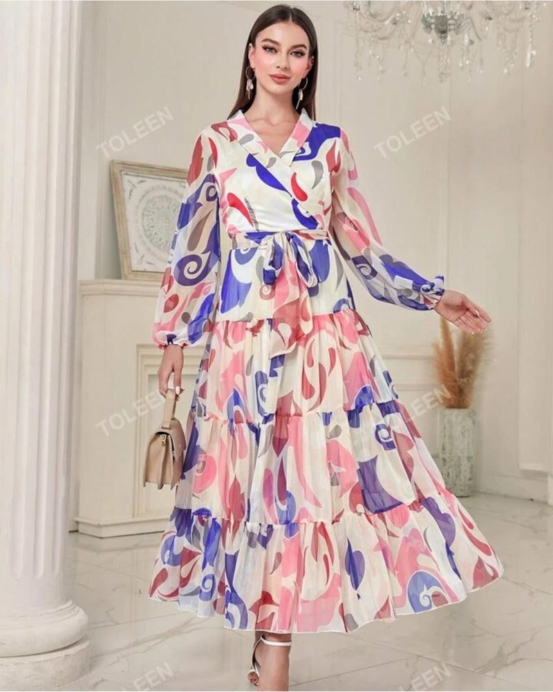 Women Allover Print Lantern Sleeve Ruffle Hem Belted Dress S4605791 XL | TUZZUT Qatar Online Shopping Order On WhatsApp Skip to content