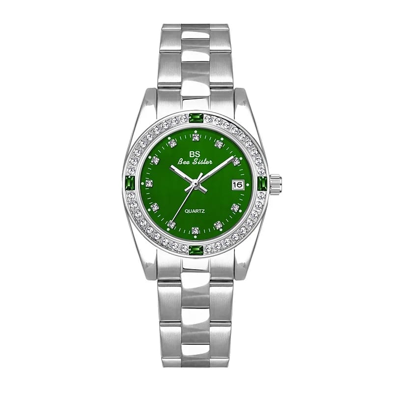Luxury Green Rhinestone Waterproof Steel Strap Calendar Quartz