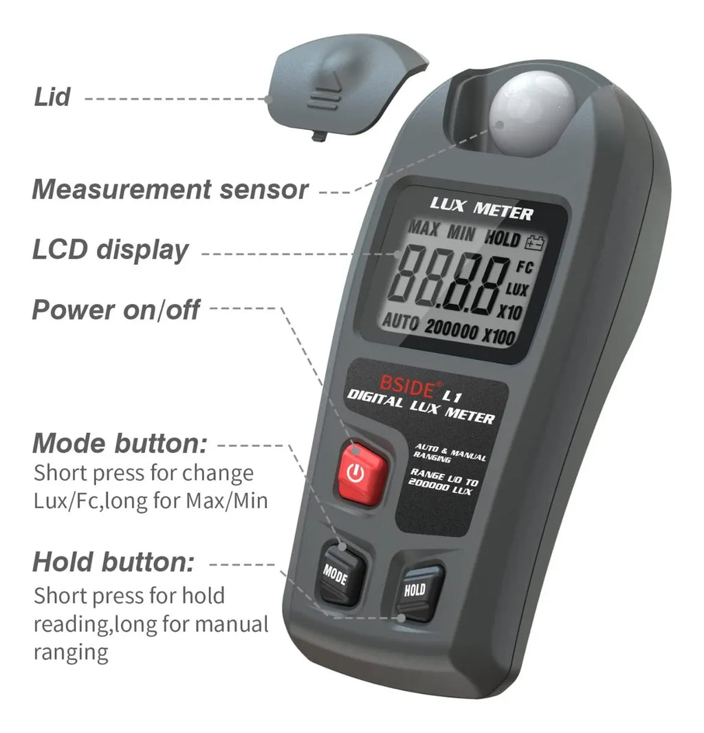 [High Accuracy]: Range: 0.1~200,000Lux / 0.01~20,000Fc; Resolution: 0.1Lux / 0.01Fc; Accuracy: ±4%.