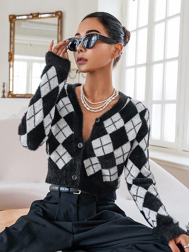 weater Dress for Women Argyle Pattern Fluffy Knit Cardigan Sweater Dress for Women