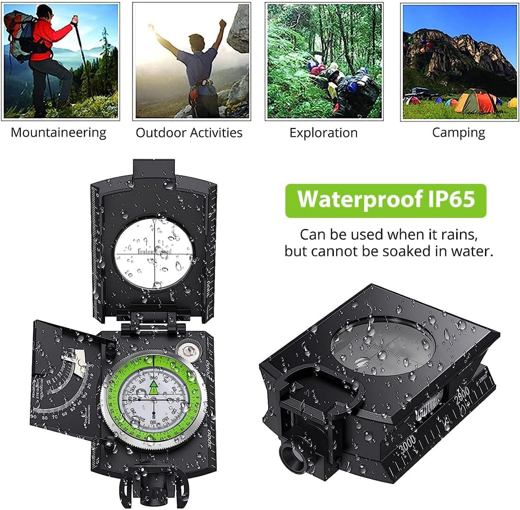 • 🧭【Multifunctional military compass】:Floating compass dial with 360° scale,adjustable prism lens,Fold metal lid,Compass with clinometer, enable to measure height and slopes,Can adapt to a variety of environments.