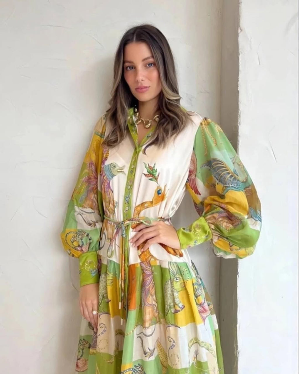 Tie Waist Silk & Ramie Shirtdress In Green Multi silk shirt dress from ALEMAIS featuring multicolour, silk, shift style, animal print, ruched detailing, belted waist, pointed flat collar, front button fastening, balloon sleeves and calf-length.