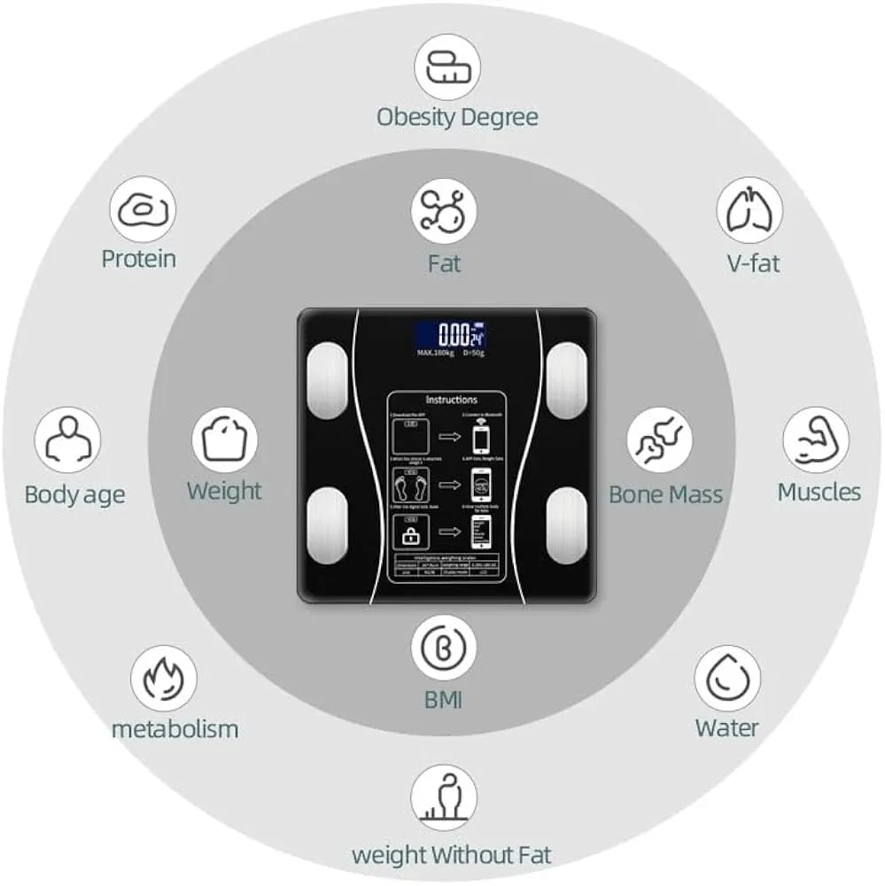 1. ALL IN ONE - 22 complete biometric analysis: Weight, BMI, BMR, Fat Mass, Body Fat, Ideal Body Weight, Muscle Mass, Muscle Rate, Protein, Fat-Free Body Weight, Body Age, Body Type, Bone Mass, Body Water, Visceral Fat, Subcutaneous Fat, Protein Mass, Muscle Mass, Body Water %, Bone Age, Skeletal Muscle %, Water Weight, Obesity Level.
