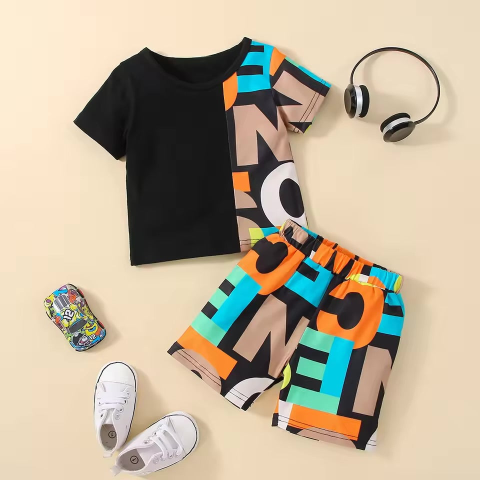Letter Print Short Sleeve T-Shirt & Pants Set, Soft and Comfortable, Black, Cotton for Kids