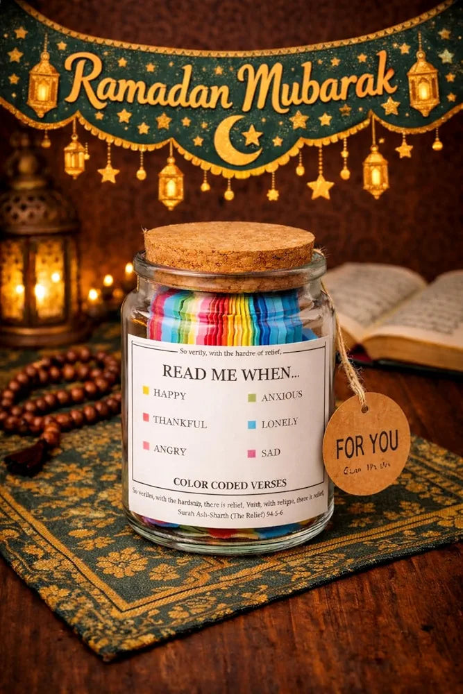 Color-coded Quran reminders for every feeling — comfort, patience, gratitude, and strength in one beautiful jar.