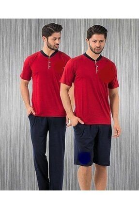 Men's Claret Red Navy Blue Pajama Set - Short Sleeve Top and Long Bottom Shorts