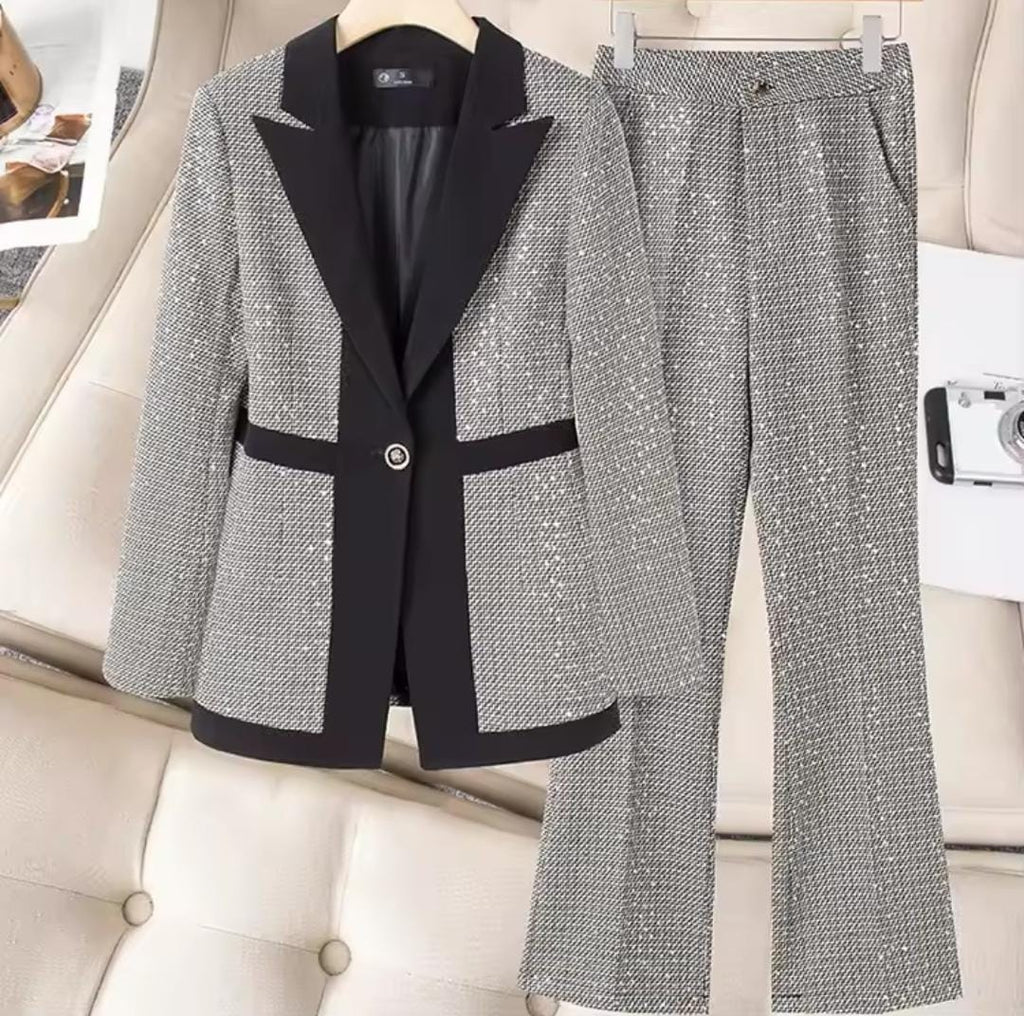 Newest 2024 Designer Runway Suit Set Women's Single Button Slim Fitting Blazer Flare Pants Suit Sequined Blazer Set Fashion.