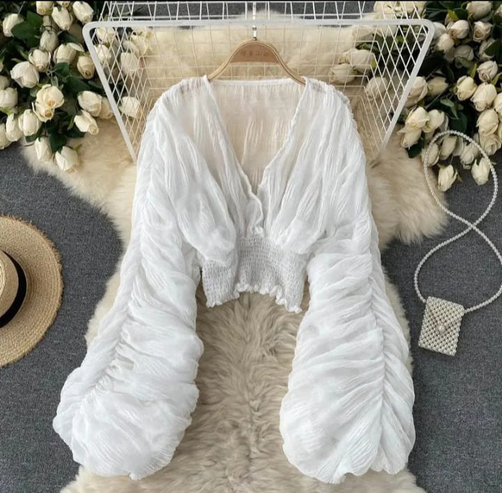 Summer Sexy Draped Chiffon Blouse for Women Elegant V-Neck Puff Long Sleeve Short Tops Female Slim Party Shirts S5015845 | TUZZUT Qatar Online Shopping Order On WhatsApp Skip to content