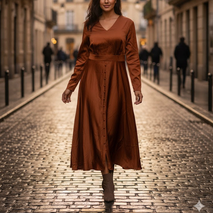 Elevate your wardrobe with our stunning Satin V-Neck Maxi Dress in a luxurious rust/burnt orange hue. The flowing, silky satin fabric drapes beautifully, offering a radiant sheen and a feeling of effortless elegance