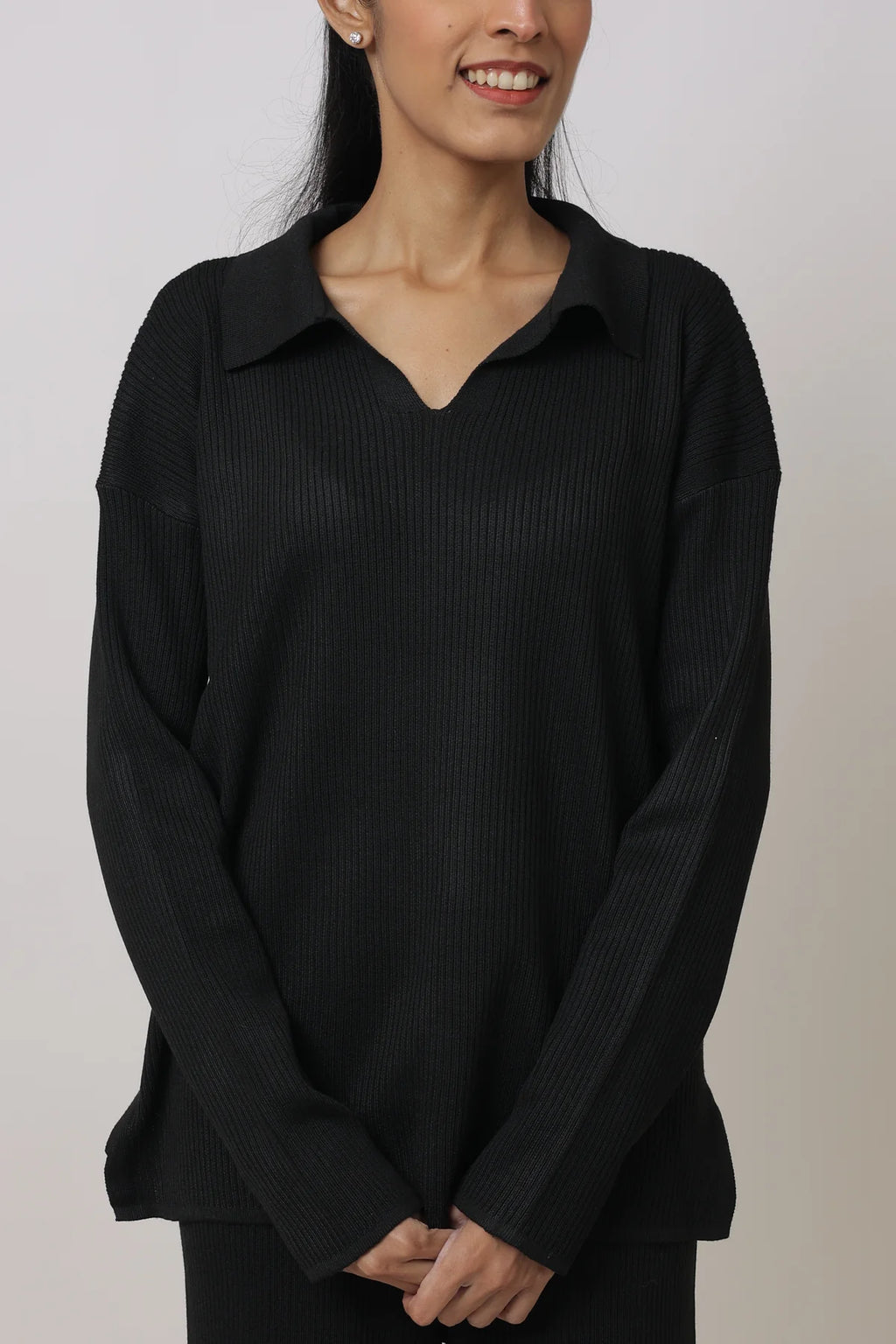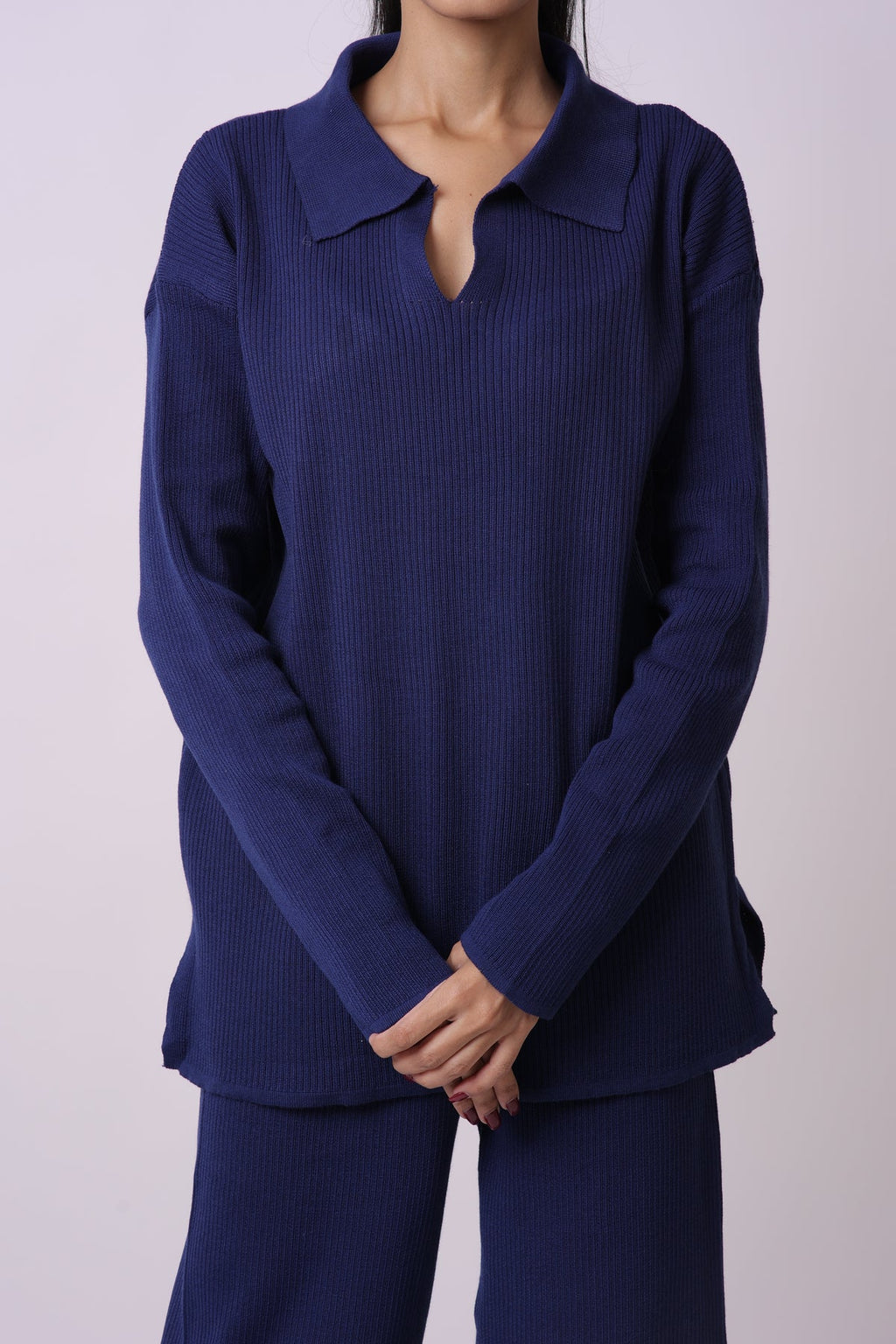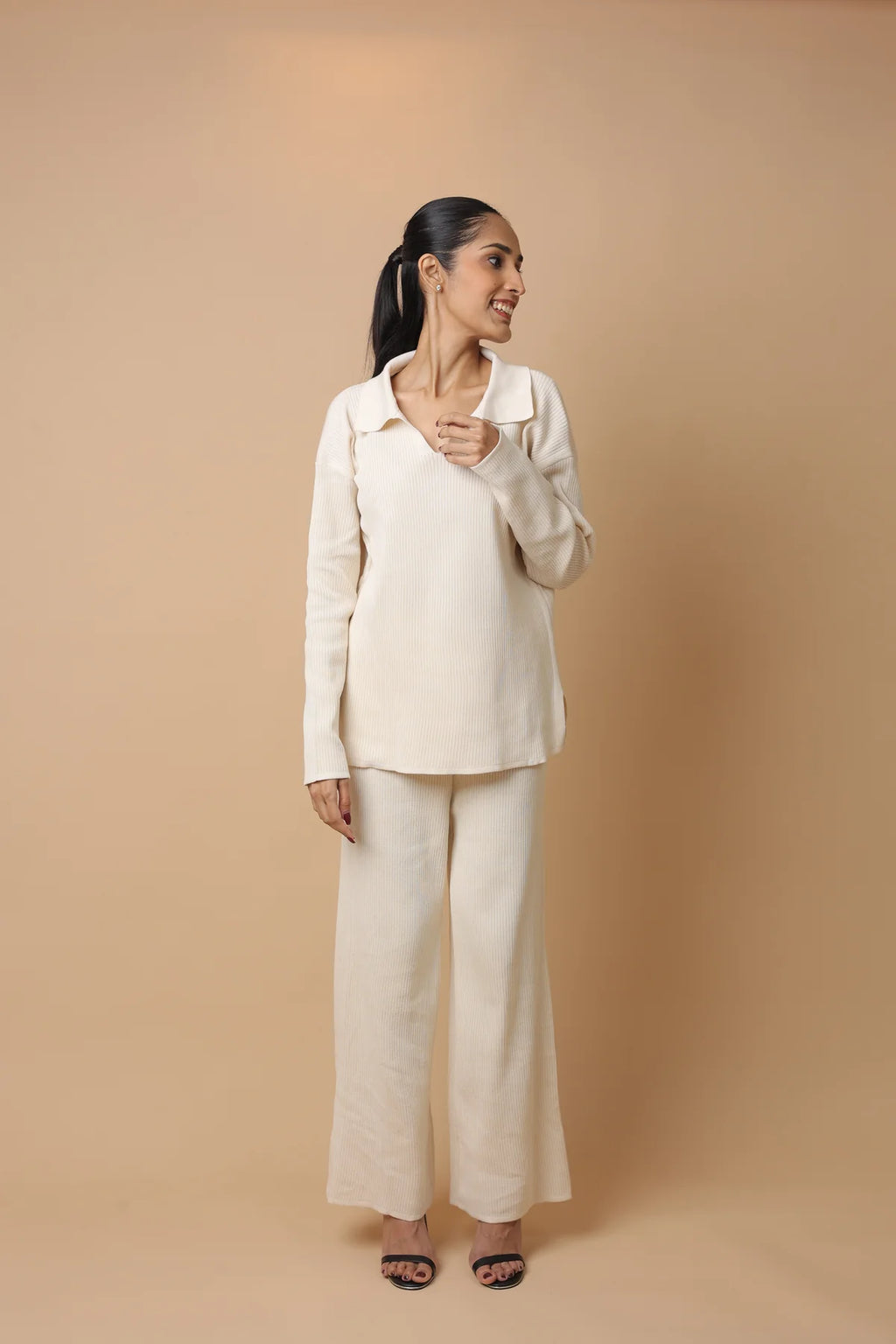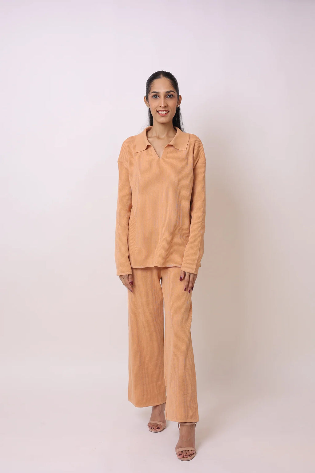 The Coord Set is your go-to for everyday loungewear. Crafted from ribbed knit fabric, the set features a matching top and wide leg pants with an elasticated waistband for ultimate comfort. The collared top adds a touch of sophistication while the set can also be dressed up with heels for a casual look.