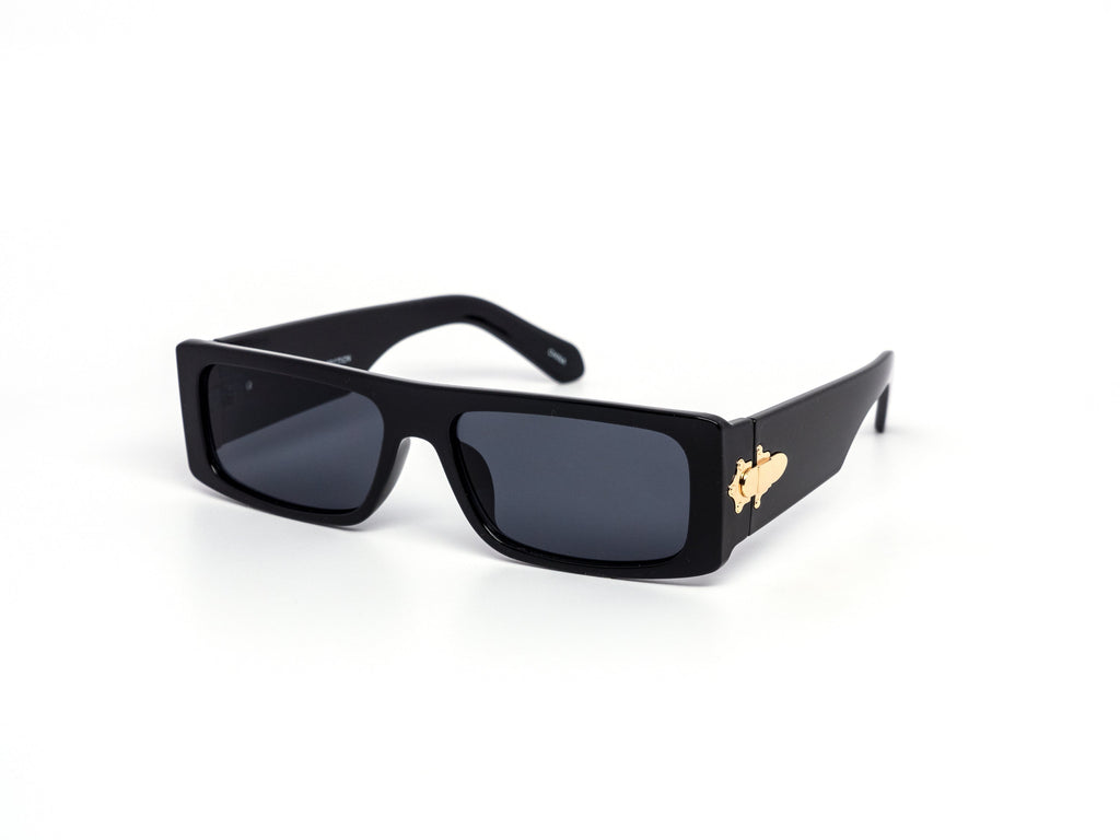 Thick minimalistic design with accented gold on the sides which comes in black frames with dark lens.