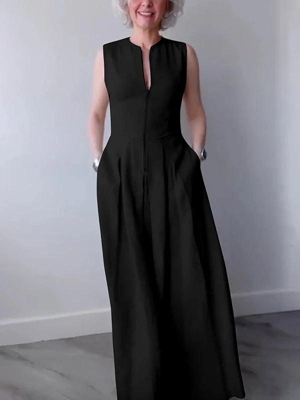 A-Line Loose Pleated Pockets Split-Joint Zipper Round-Neck Maxi Dresses