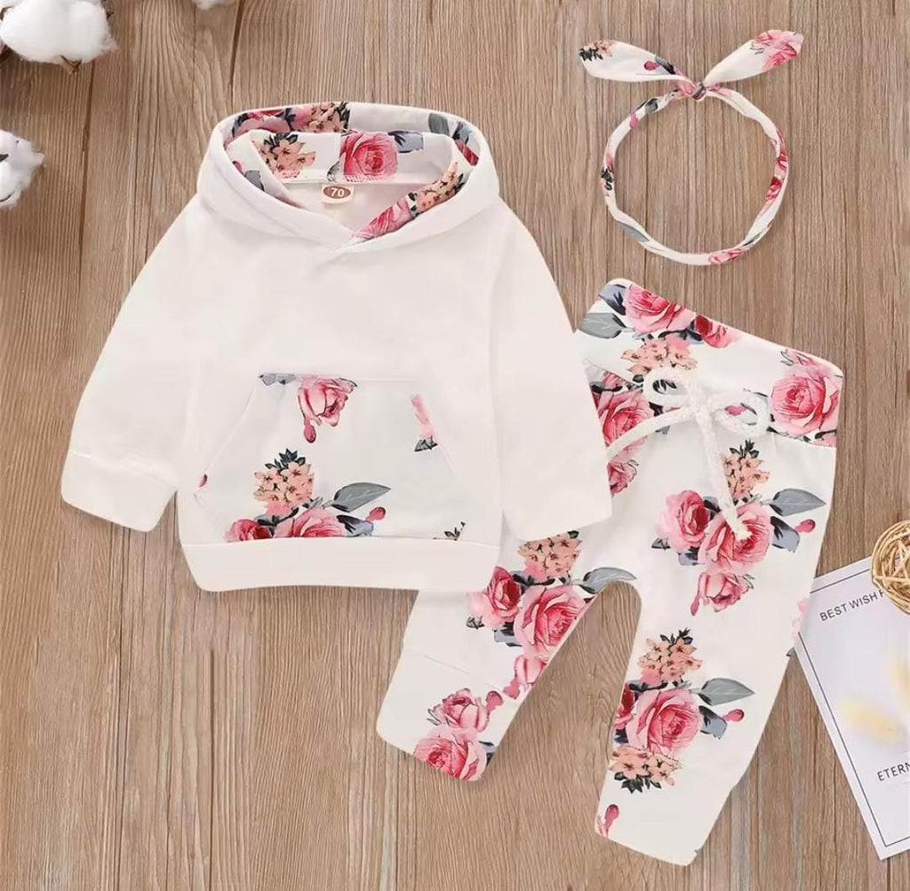 Infant Toddler Baby Girls Autumn Clothes Set Floral Printed Girls Hooded Pullover Tops Pants Outfits Set Clothes.