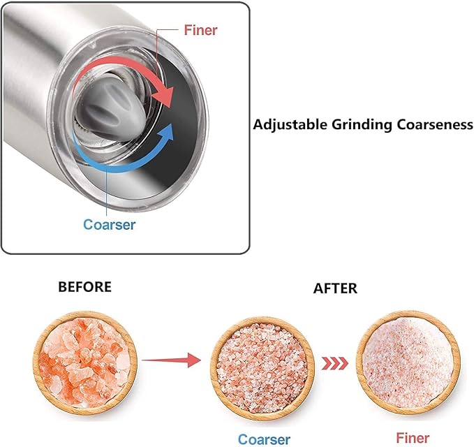 • 【Adjustable Grinder】 Many grinding levels for your choice allows you to grinder your spices from coarse to fine. Electric Pepper and Salt Grinder use a high-quality ceramic rotor. You can choose the coarseness of your spice, salt or pepper by turning adjustment knob at the head of the grinder.