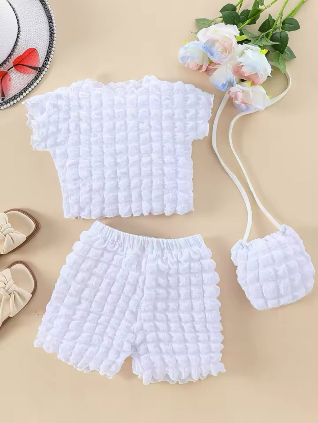Girls Summer New Style Comfortable Trendy Casual Bubble Cloth Pure Color 3PCS Short Sleeve + Shorts + Bag Set